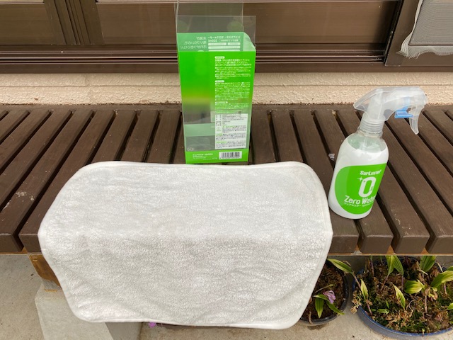 4:シュアラスター ゼロウォーターを50㎝四方でワンプッシュのイメージで、吹き付けて付属のファイバークロスで、伸ばしながらふき取る。