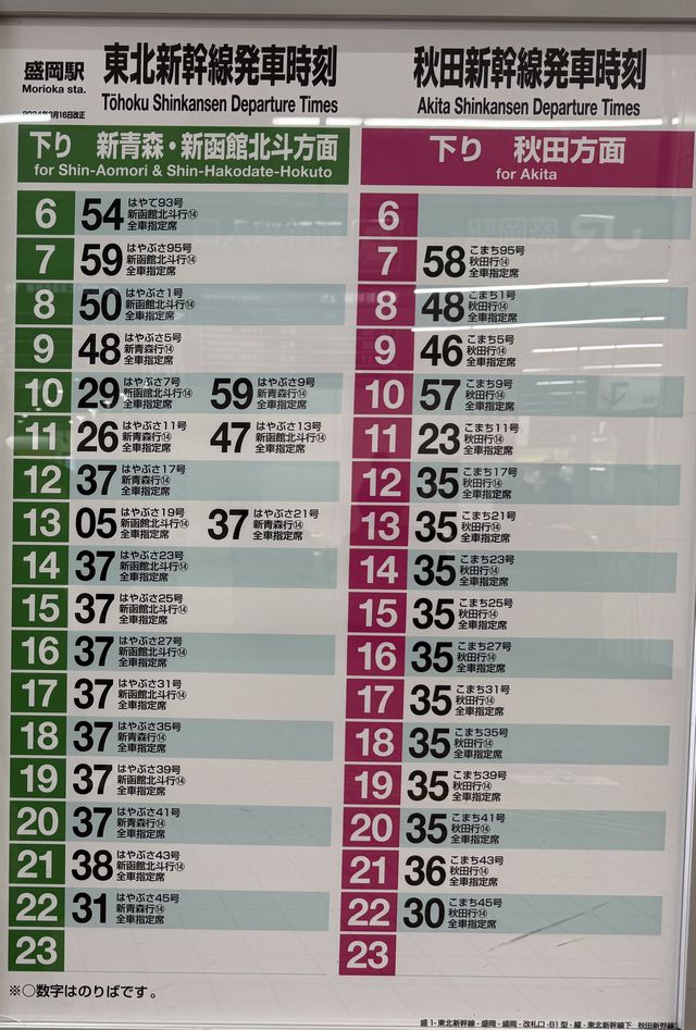 盛岡駅から東京駅:新幹線の時刻表と電車料金と所要時間の一覧表