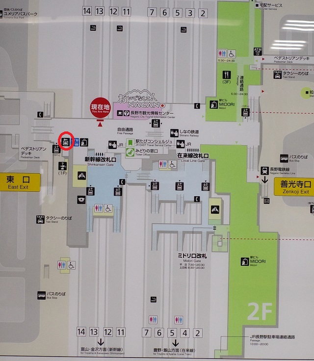 長野駅に掲示の構内図でコインロッカーの設置場所を紹介