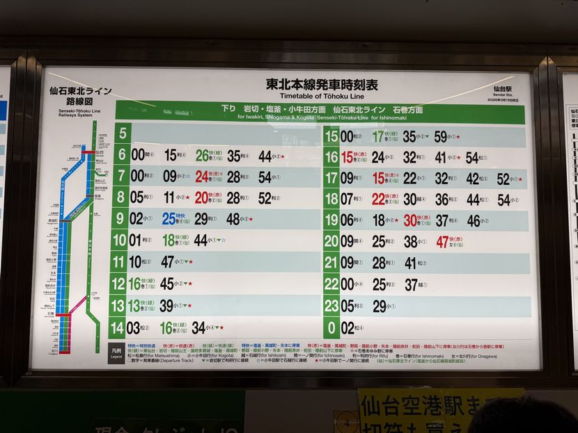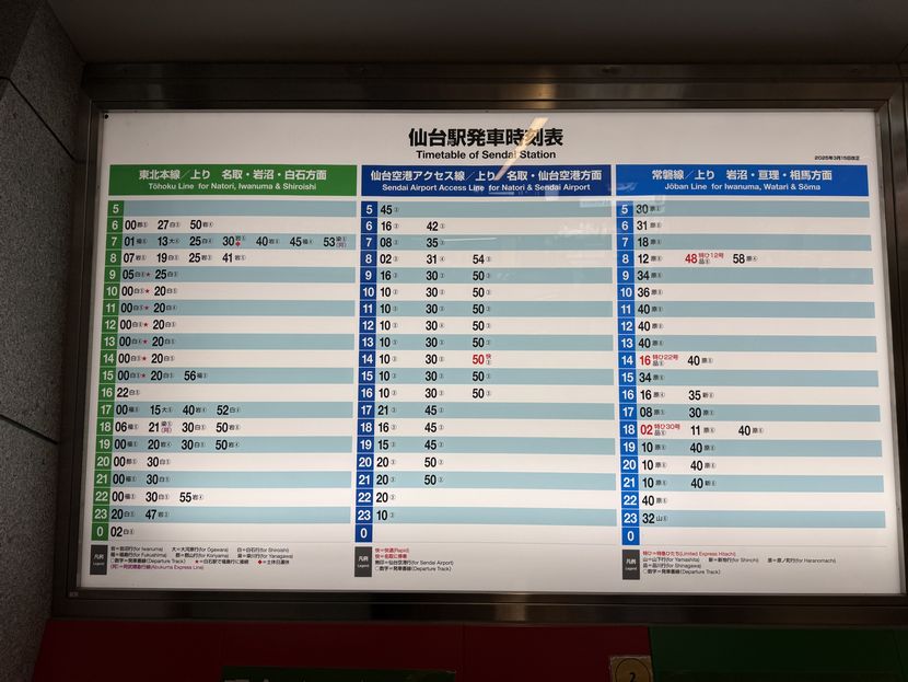 仙台駅に掲示の、時刻表の掲示板の写真は以下です。