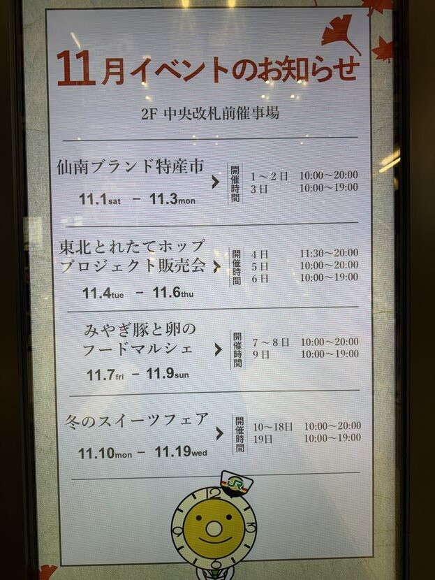 | 10月24日〜10月31日 | 仙台ステーションハロウィーン2025:10時~20時(最終日19時) |