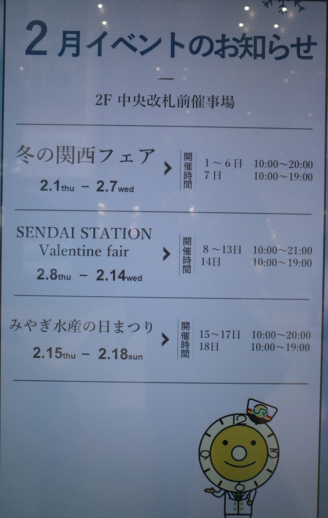 | 2月8日~2月14日 | SENDAI STATION Valentine Fair:8~9日:10時~20時:10~13日:21時まで |